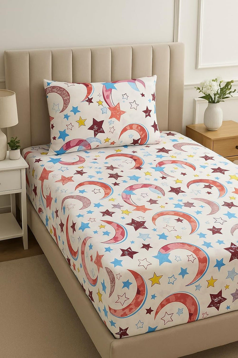 Soft Moon Printed Fitted Bedsheet Single 90x190x20 Washable Cotton Fabric. Premium Fitted Bedsheet with 2 Pillows Case 75x50 cm with Prime Elastic Material.(Small Single)